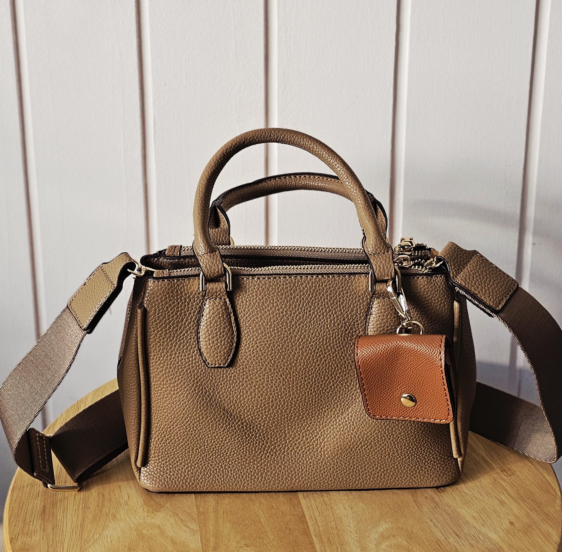 Sie bietet zwei große Hauptfächer mit Reißverschluss sowie eine praktische Mini-Pouch am Karabiner für kleine Essentials. Dank des breiten, verstellbaren Schultergurts kann die Tasche flexibel als Handtasche, Schultertasche oder Crossbody getragen werden.