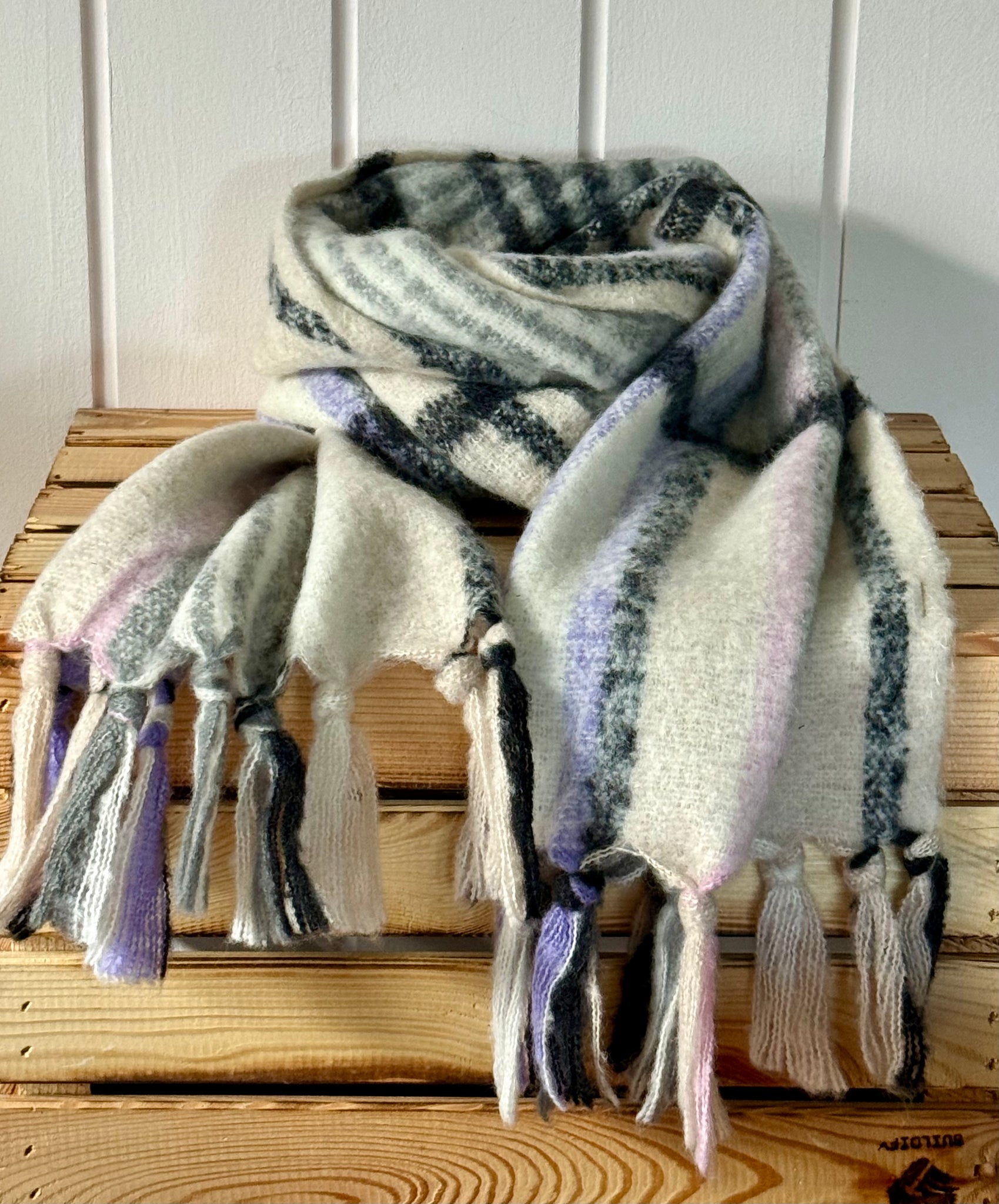 Das zeitlose Karomuster in Grau, Flieder und Creme lässt sich vielseitig kombinieren und verleiht jedem Outfit eine feminine, stilvolle Note. Durch seine Länge von ca. 2 m lässt er sich individuell tragen – ob klassisch geschlungen, locker gelegt oder elegant drapiert.