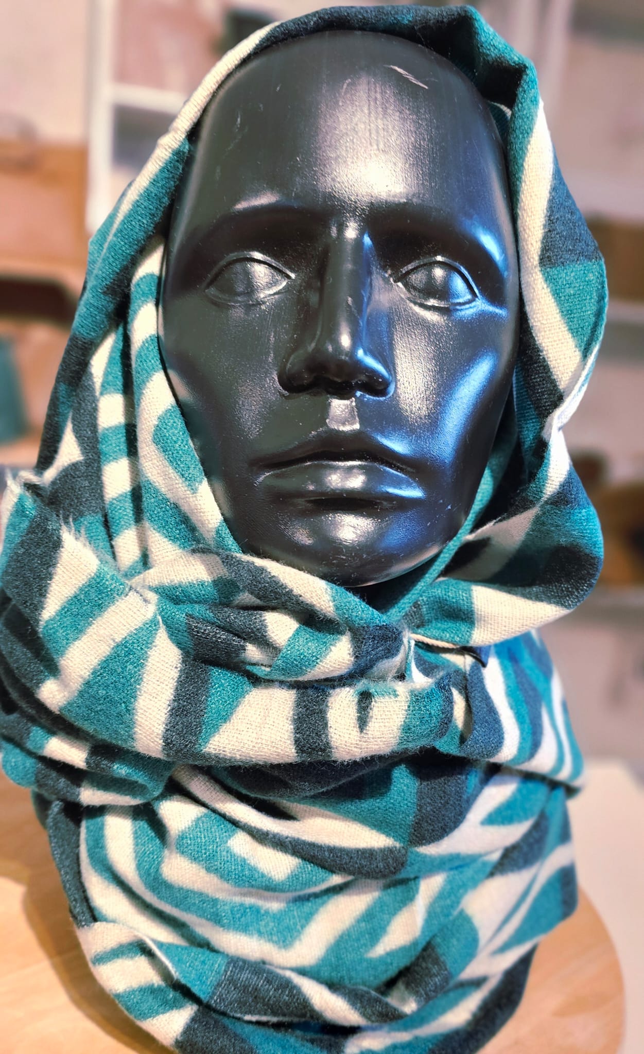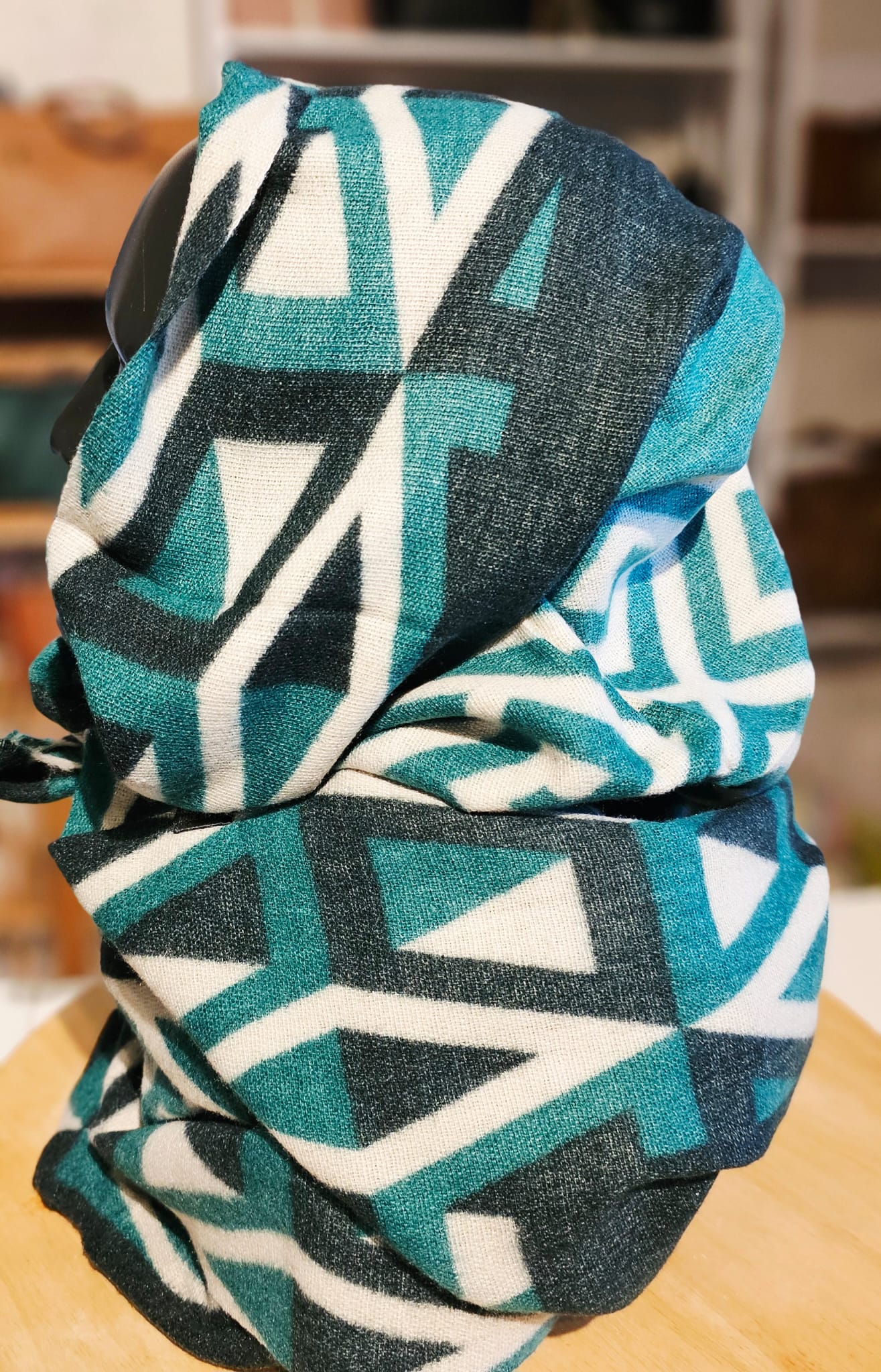 Je nach Bildschirm und Lichtverhältnissen können die Farben leicht vom Original abweichen. Der Schal ist in einem kräftigen Petrol mit geometrischem Muster gehalten.